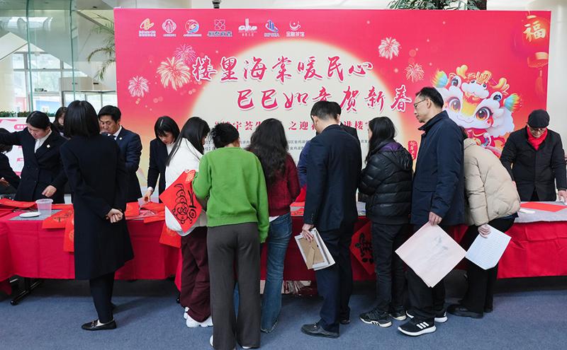 活動現場一片歡樂祥和的節日氛圍,前來領取春聯及福字的員工絡繹不絕,大家手捧著新鮮出爐的春聯,臉上洋溢著幸福的笑容,對書法家們的精湛技藝贊不絕口。一位在國際大廈工作的員工表示:“在超市選購春聯雖然方便,但現場手寫的春聯更有溫度、更有年味。我拿到了一副很合我心意的手寫春聯,一定要把這份福氣帶回家。”短短兩個小時內,現場就送出了約500副春聯和500個福字,將滿滿的福氣傳遞到每個人手中。