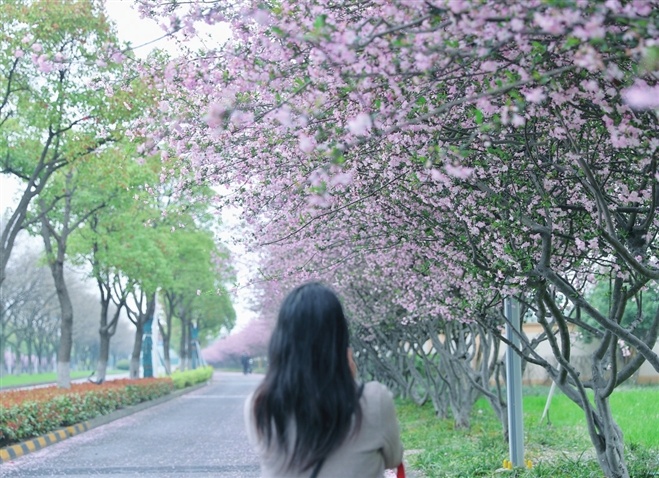 蘇州工業園區陸涇路上的海棠進入盛花期,粉嫩的花朵開滿枝頭。