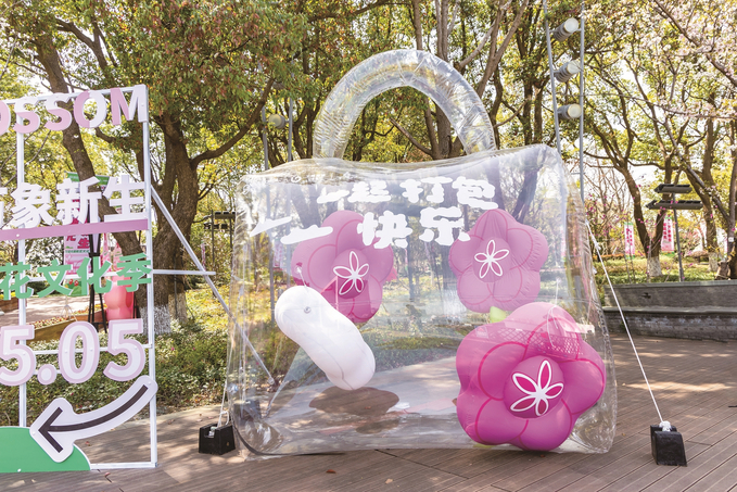 從桃花島碼頭下船登島,游人的視線很快被一片粉色浪漫所吸引。以桃花為關(guān)鍵元素,從氛圍營造到地標(biāo)指引,再到裝置藝術(shù)……這個春日,桃花島被一片粉色所包圍。