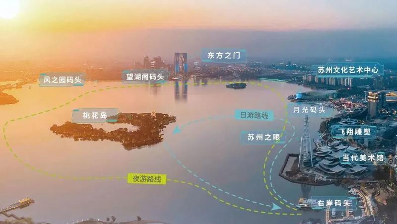 日游航線——登島線:沿途觀賞當代美術館、“蘇州之眼”摩天輪、“飛翔”雕塑等城市地標后,登上桃花島游覽。
