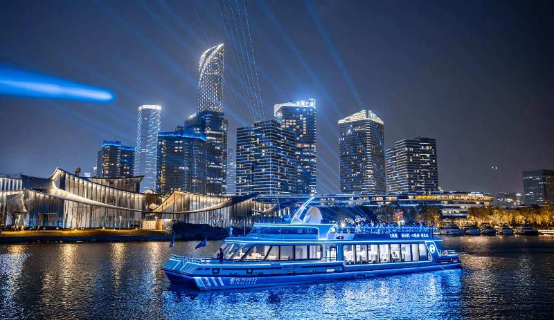 “金雞湖號”參考?xì)W洲熱門游船船型設(shè)計,集游覽觀光、休閑娛樂于一體。一樓全景客艙視野通透,盡收金雞湖美景;二樓觀光甲板360°沉浸式感受乘風(fēng)破浪和湖光水色。右岸新航線則以全新雙體游船為載體,串聯(lián)CBD地標(biāo)、藝術(shù)建筑群與生態(tài)島嶼,構(gòu)建起“水岸光影聯(lián)動、晝夜雙景切換”的文旅消費新范式。