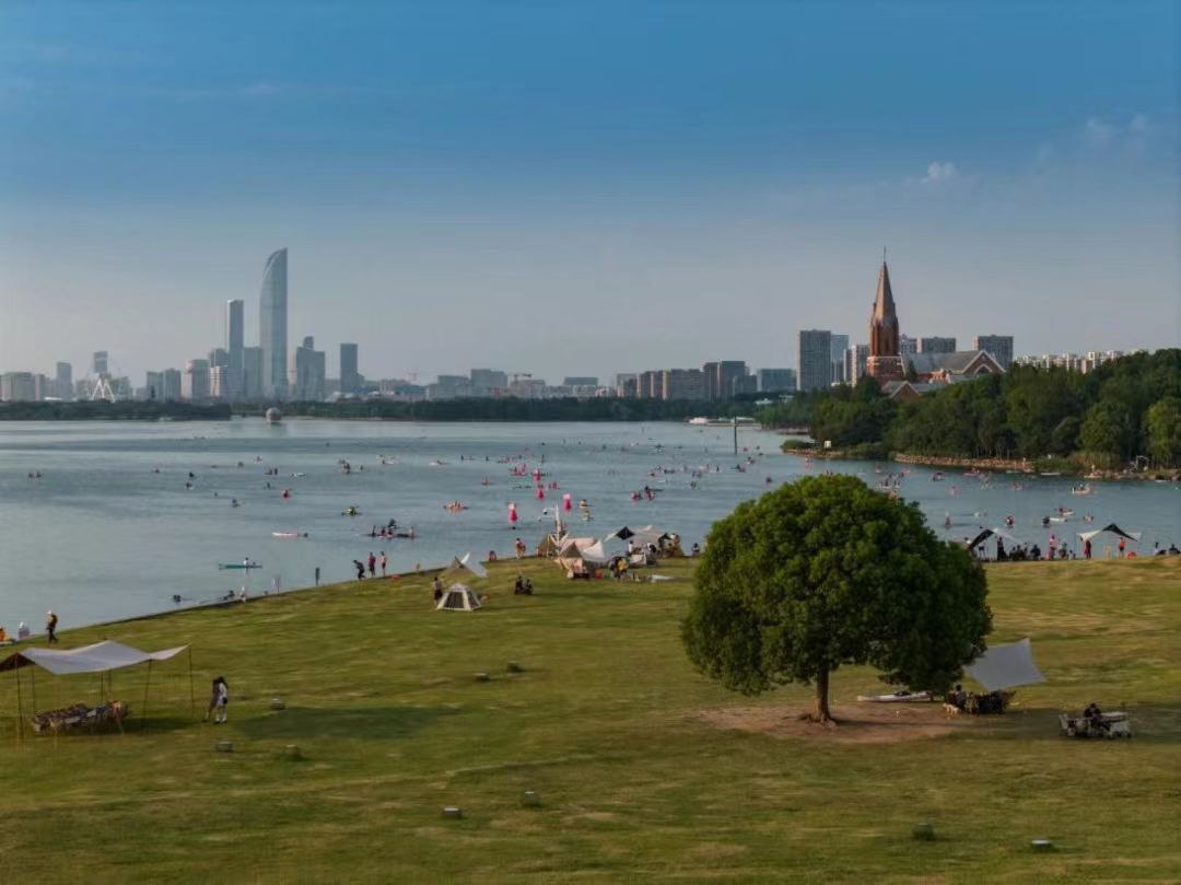 傍晚的獨墅湖,完美地承接了從書齋到生活、從思考到抒情的過渡。當夕陽的余暉將獨墅湖染成一片溫暖的橙紅,人們不約而同地走向那個著名的文化地標——“一棵樹”。它或許平凡,但在獨墅湖畔,它已成為一種精神象征,承載著年輕人的浪漫、友誼與對美好生活的向往。假期里,這里也成為露營勝地,歡聲笑語不斷。