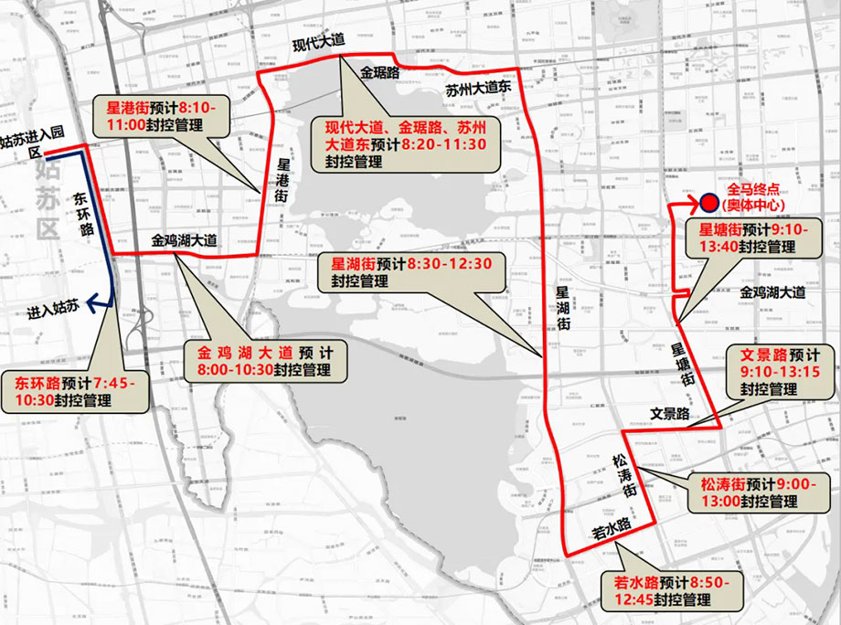 此次蘇馬,園區(qū)路線長、范圍廣,為保障賽事進行,同時最大化減少對市民游客出行的影響,園區(qū)賽段將分時分路段實施全封閉、半封閉、半幅封閉的臨時交通管控,同時針對婁葑片區(qū)、湖西CBD片區(qū)、湖西中茵皇冠周邊、湖東CWD片區(qū)、月亮灣片區(qū)、斜塘片區(qū)、蘇州大學(xué)附屬第四醫(yī)院(獨墅湖醫(yī)院)等區(qū)域,提供區(qū)域機動車繞行方案。園區(qū)相關(guān)酒店在公安等多部門的指導(dǎo)下,也提前準備,積極做好出行提醒,讓市民游客充分感受到城市的熱度與溫度。