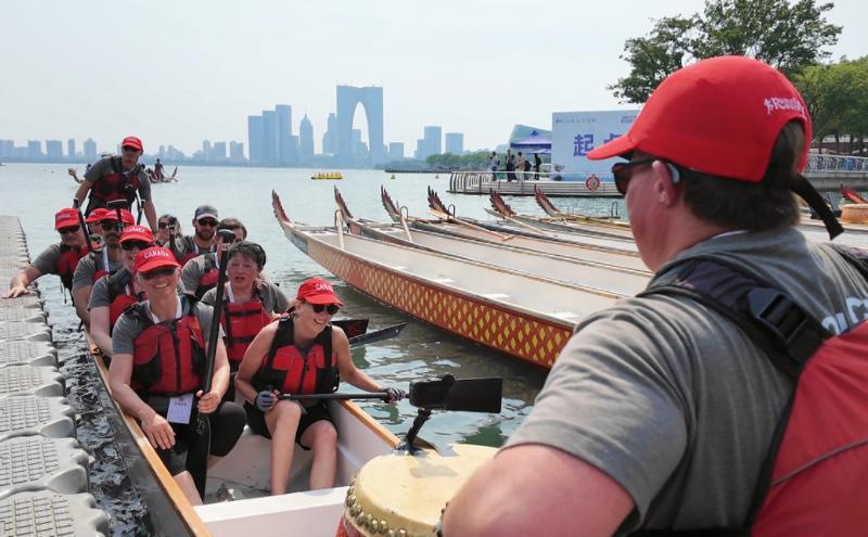 五月的金雞湖畔,陽光正好,涼風習習。2025金雞湖端午龍舟賽開賽前夕,一支身著灰色T恤、頭戴“小紅帽”的外籍友人龍舟隊在月光碼頭亮相,其身影在湖畔格外引人注目,他們就是來自加拿大維多利亞市的龍舟隊。隨著鼓點響起,槳葉破開粼粼波光,激起層層漣漪,一場跨越萬里的龍舟之約就此展開,這不僅是他們時隔六年重返蘇州的剪影,更是中加友誼之舟在碧波間續寫的嶄新航跡。