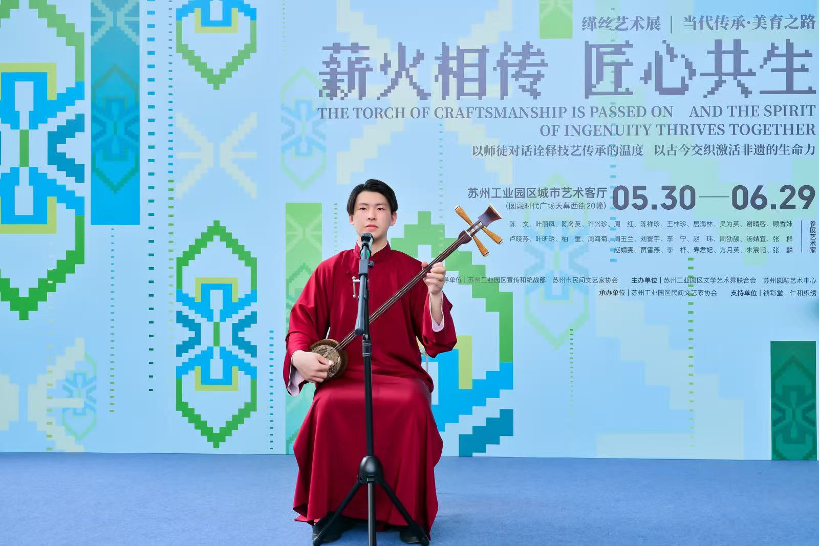 活動(dòng)中,青年評(píng)彈演員朱江帶來(lái)以蘇州工業(yè)園區(qū)為背景的原創(chuàng)曲目《金雞起舞》,以現(xiàn)代藝術(shù)形式展現(xiàn)了園區(qū)的“古韻今風(fēng)”,將氣氛推向高潮。現(xiàn)場(chǎng)熱鬧非凡,市民游客不僅觀賞到了精美的緙絲藝術(shù)展,還積極參與了吹糖人、漆扇制作等互動(dòng)體驗(yàn)。這些端午傳統(tǒng)民俗活動(dòng)讓市民在感受文化魅力的同時(shí),也充分體驗(yàn)到了節(jié)日的祥和氛圍。