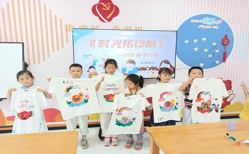 在“時光拓印局”主題活動現場,“紅管”志愿者耐心指導著拓印技巧,幫助每個家庭創作出獨具特色的作品。創作過程中,家長和孩子們在純白T恤上揮灑創意,有的以傳統紋樣為靈感繪制精美圖案,有的則發揮想象力用鮮艷色彩描繪童趣世界。這場活動不僅讓孩子們體驗到動手制作的樂趣,增進了親子感情,更讓傳統文化以生動的方式融入日常生活。