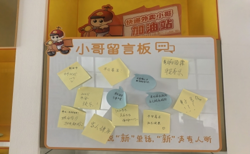 這里召開了“新就業群體座談會”,通過面對面與美團、餓了么、叮咚買菜等小哥交流,了解他們的實際需求等??蛷d內設置有“小哥留言板”,讓您心煩可傾訴、“新”聲有人聽。