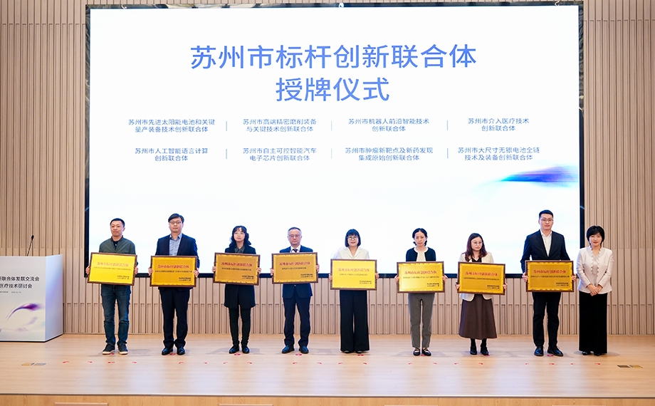 活動現場為8家標桿創新聯合體授牌,這些聯合體在模式創新與成果轉化方面成效顯著,為全市提供了可復制、可推廣的“八大樣本”。其中,來自蘇州工業園的聯合體占據四席,貢獻了重要力量,包括沛嘉醫療牽頭的介入醫療技術創新聯合體、思必馳牽頭的人工智能語言計算創新聯合體、亞盛藥業牽頭的腫瘤新靶點及新藥發現集成原始創新聯合體,以及羅博特科牽頭的大尺寸無銀電池全鏈技術及裝備創新聯合體。