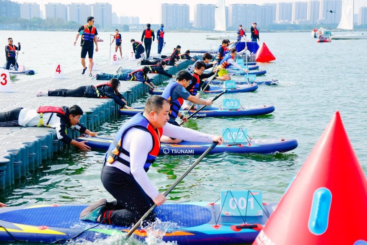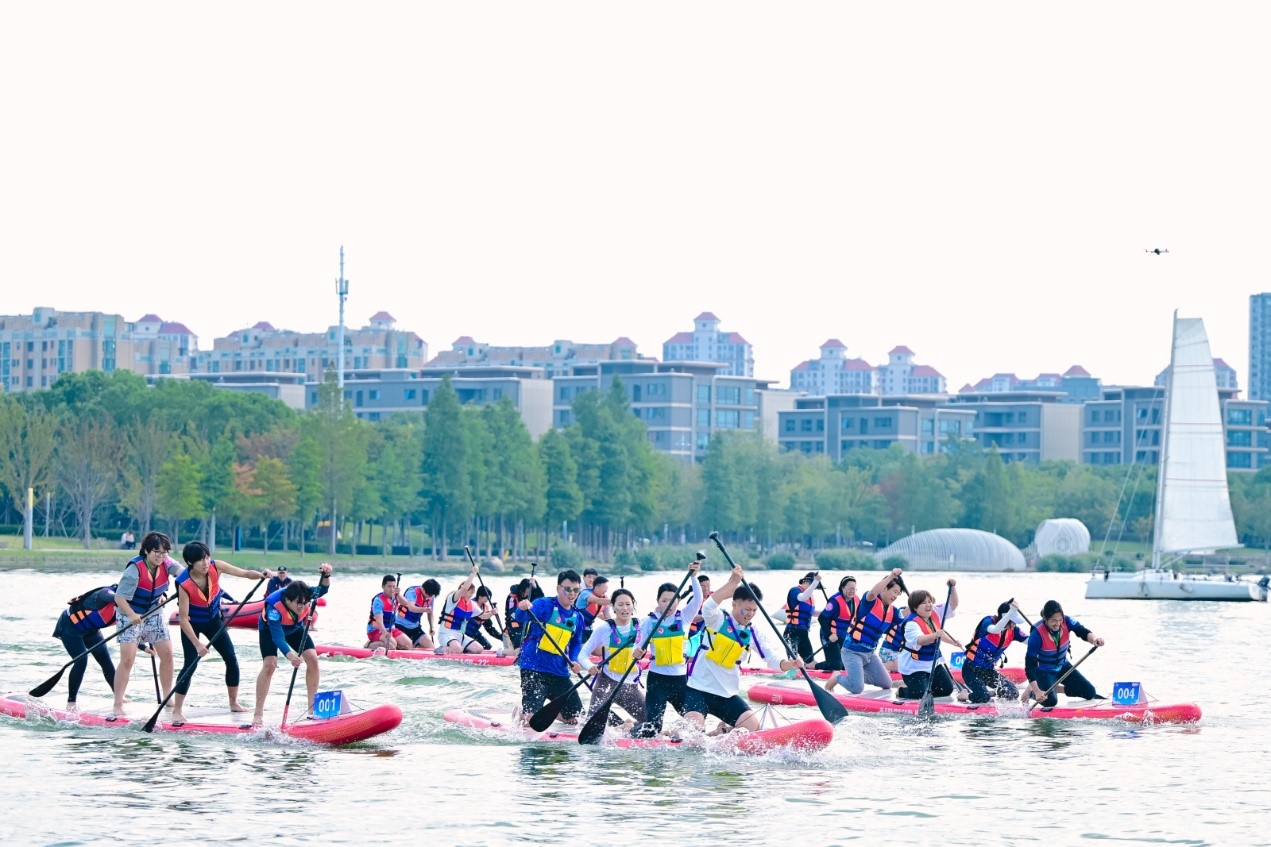 “今天天氣條件很好,湖面平靜,非常適合槳板運動。”來自西交利物浦大學代表隊的隊員表示,隊伍平時會開展平衡性訓練、直線劃行等練習,希望能在這場比賽中發揮出最好水平。值得一提的是,聚焦科教創新區特色,來自園區各科研院所的十余位領軍人才組成代表隊,從實驗室走向水域賽場,展現出科研工作者別樣的活力與風采。“雖然剛開始接觸這項運動,但槳板運動帶來的與自然融合的體驗讓人感到非常舒適,期待以賽會友,在競逐中促進交流學習?!眻@區科研院所領軍人才代表隊隊員程功弼說道。