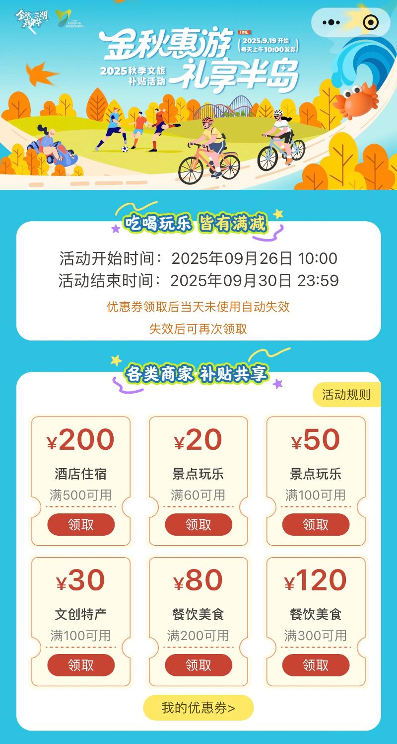 即日起至9月30日,每日10:00起,“惠游園區(qū)”小程序?qū)⑾蘖堪l(fā)放文旅消費(fèi)券,覆蓋餐飲、住宿、文創(chuàng)、娛樂等多個(gè)場(chǎng)景。市民游客只需注冊(cè)登錄小程序,進(jìn)入文旅消費(fèi)活動(dòng)專題頁(yè)面,即有機(jī)會(huì)領(lǐng)取不同面額的優(yōu)惠券,數(shù)量有限、先到先得。